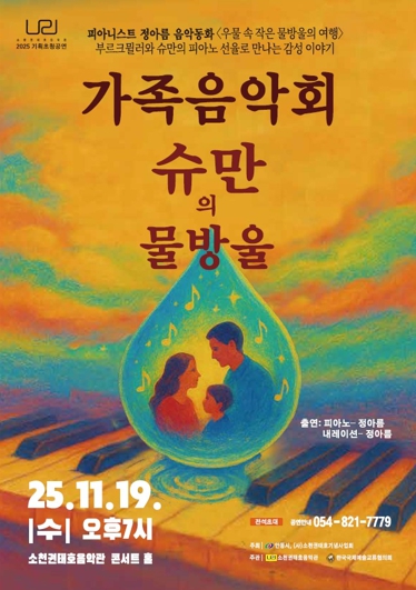 음악동화 ‘우물 속 작은 물방울의 여행’은 깊은 우물 속에서 살아가던 작은 물방울이 세상 밖으로 나와 다양한 친구들을 만나고, 강물을 따라 바다에 이르기까지 성장하는 이야기를 담고 있다. 부르크뮐러의 〈소녀의 기도〉로 시작되는 우물의 고요한 분위기, 슈만의 〈아라베스크〉를 통해 표현되는 세상 밖으로의 첫걸음, 〈이국과 사람들〉․〈트로이메라이〉 등에 녹아 있는 우정과 감정의 변화 등, 19세기 낭만주의 피아노 명곡들이 이야기의 흐름을 섬세하게 그린다. 피아노 연주와 내레이션이 조화롭게 어우러져, 마치 한 편의 애니메이션을 눈앞에서 보는 듯 생생한 음악의 풍경을 펼쳐낼 예정이다.