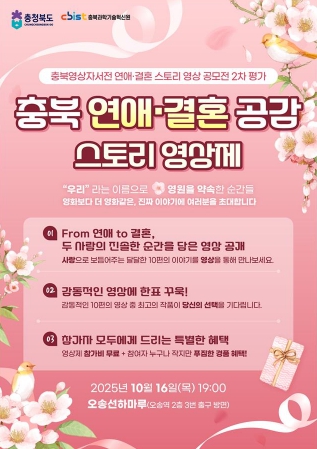강창식 충북도 정책기획관은 “이번 영상제는 단순한 공모전을 넘어 도민 모두가 함께 공감하고 즐기는 축제의 장”이라며 “우리 이웃들의 진솔하고 따뜻한 사랑 이야기를 통해 결혼과 가족의 소중한 가치를 되새기는 시간이 될 것”이라고 말했다.
