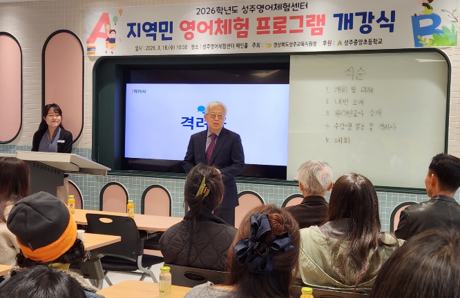 [뉴스노크=김인호 기자] 경상북도 성주교육지원청 산하 성주영어체험센터는 지역민의 영어 의사소통 능력 향상과 평생학습 문화 확산을 위해 '2026학년도 지역민 영어 회화 프로그램' 개강식을 성주영어체험센터 메인홀에서 개최했다.