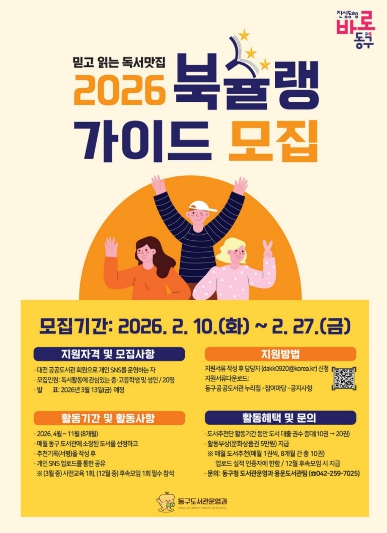 [뉴스노크=김인호 기자] 대전 동구는 책을 사랑하고 글쓰기에 관심 있는 구민을 대상으로, 2026년 동구 도서추천단 ‘북슐랭 가이드’를 모집한다고 10일 밝혔다.