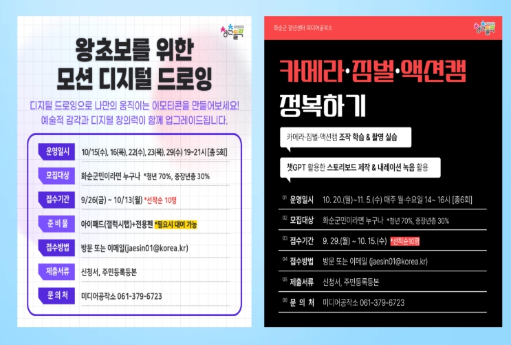 [뉴스노크=김인호 기자] 화순군(군수 구복규)은 오는 10월 15일과 20일 화순군 청년센터(청춘들락) 미디어공작소에서 영상 제작과 디지털드로잉 분야의 창의적 미디어 교육 프로그램을 시작한다고 밝혔다.