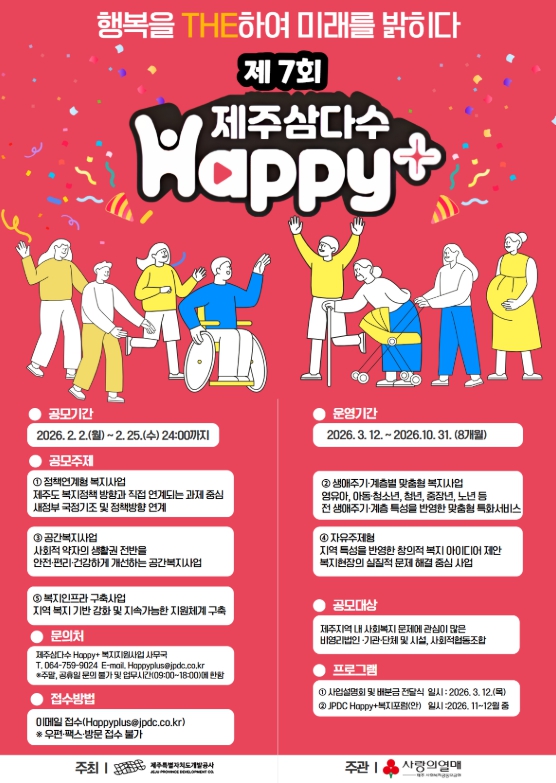 [뉴스노크=김인호 기자] 제주삼다수를 생산·유통하는 제주특별자치도개발공사(사장 백경훈)는 도내 복지 사각지대 해소를 위한 혁신적인 아이디어를 발굴하는 ‘제7회 제주삼다수 Happy+ 복지 지원사업’의 공모 접수가 오는 25일 마감된다고 밝히며, 도내 역량 있는 단체들의 적극적인 참여를 독려했다.
