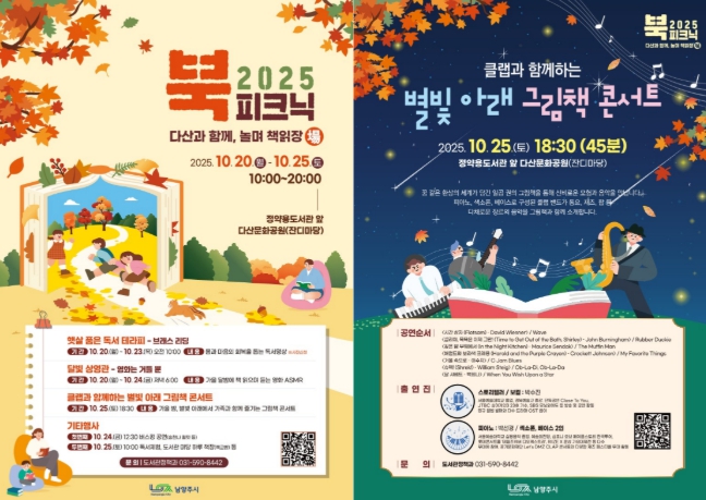 [뉴스노크=김인호 기자] 남양주시는 10월 20일부터 25일까지 6일간 정약용도서관 앞 다산문화공원 잔디마당에서 ‘2025 북피크닉: 다산과 함께, 놀며 책읽장(場)’을 운영한다.