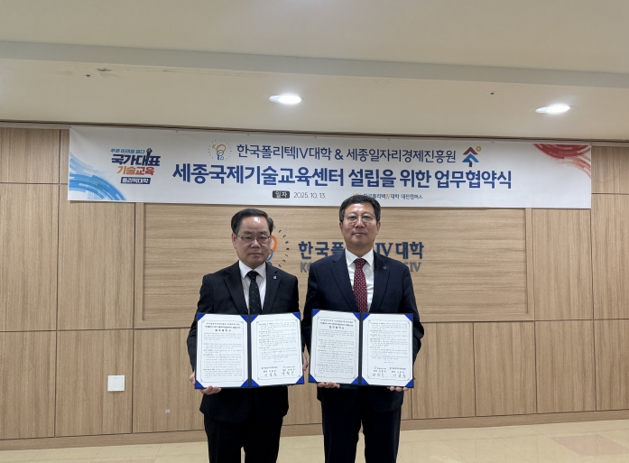 [뉴스노크=김인호 기자] 세종일자리경제진흥원과 한국폴리텍Ⅳ대학은 13일 한국폴리텍Ⅳ대학 대전캠퍼스에서 ‘세종국제기술교육센터’ 설립 및 운영을 위한 업무협약을 체결했다.