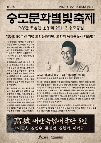 [뉴스노크=김인호 기자] 평화 경제 거점도시 강원 고성군은 오는 8월 14일 오후 6시, 토성면 운봉리 숭모공원 일원에서 ‘2025 숭모문화 별빛축제–동해안 최초 만세운동의 길’을 개최한다.