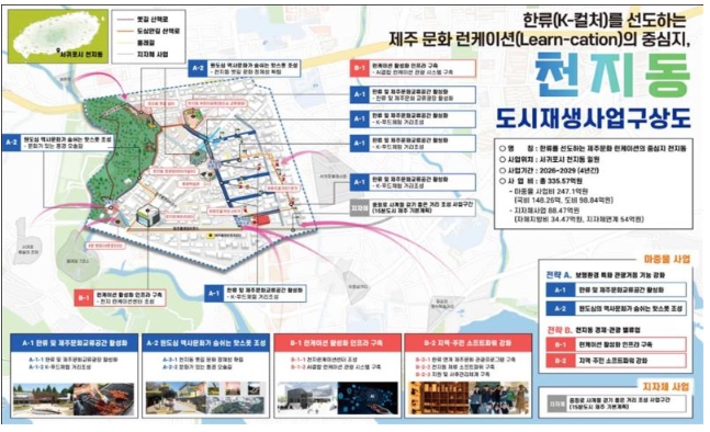 특히, 올해 7월에 변경된 국토교통부 가이드라인에 따라 지역특화재생사업의 유형으로 추진하고 있으며, 이번 사업은 지역 고유자산을 활용한 한류(K-컬처)를 선도하는 제주 문화 런케이션의 중심지, 천지동을 목표로 하는 도시브랜드화에 중점을 두고 있다.