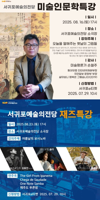이번 프로그램은 8월부터 9월까지 미술사, 여행, 재즈를 주제로 총 4회 구성됐으며, 8월은 재즈공연과 미술사 특강, 9월은 여행 인문학과 영화로 듣는 재즈 히스토리 특강이 서귀포예술의전당 소극장에서 진행될 예정이다.