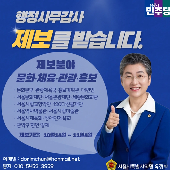 [뉴스노크=김인호 기자] 서울특별시의회 문화체육관광위원회 유정희 의원(더불어민주당, 관악4)은 10월 14일부터 11월 4일까지 시민 의견을 직접 접수받는 ‘행정사무감사 시민제보창구’를 운영한다고 밝혔다.