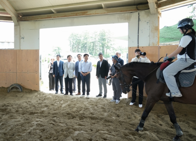 ❏오영훈 지사는 이후 승마 및 서핑 수업이 진행 중인 민간체육시설을 찾아 수업을 참관하고 지도자와 관계자들을 격려하며 현장의 애로사항을 청취했다.
