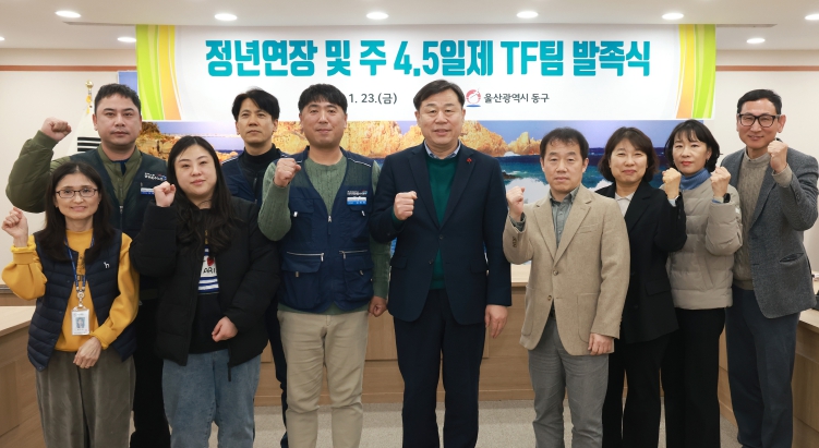 [뉴스노크=김인호 기자] 울산 동구는 1월 23일 오후 4시 동구청 상황실에서 구청장을 비롯해 자치단체공무직본부 동구지회장, 조합원 등 기관 및 노조 관계자 10명이 참석한 가운데 ‘정년연장 및 주 4.5일제 논의를 위한 TF팀 발족식’을 개최했다.