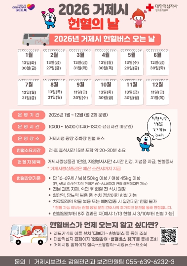 거제시 헌혈의 날은 월 2회 운영되며, 상세 일정은 대한적십자사 헌혈버스 찾기 또는 레드커넥트 어플을 통해 확인할 수 있다.