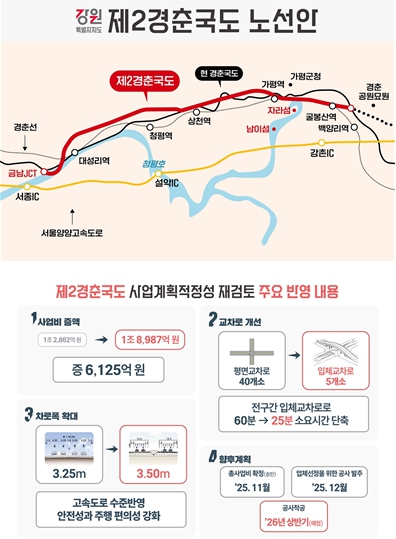 [뉴스노크=김인호 기자] 강원특별자치도는 기획재정부가 8월 20일 개최한 2025년도 제8차 재정사업평가위원회에서 '제2경춘국도 건설사업'이 사업계획 적정성 재검토를 통과함에 따라, 연내 발주에 청신호가 켜졌다고 밝혔다.
