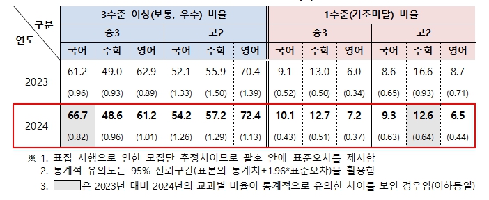 3수준(보통학력) 이상에서는 중3 국어의 비율이 66.7%로, 전년 대비 5.5%p 유의하게 증가했다. 1수준(기초학력 미달)은 고2 수학의 비율이 12.6%로, 전년 대비 4.0%p 유의하게 감소했다. 다른 과목에서는 유의한 변화를 보이지 않았다.