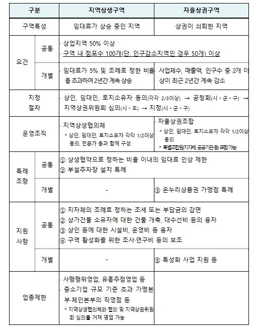 한편,'지역상권법'에 따른 활성화구역은 젠트리피케이션 우려가 있는 지역상생구역과 쇠퇴상권 중심의 자율상권구역으로, 해당 구역제도는 지역상권 구성원 간의 상호 협력을 증진시키고 지역상생발전 및 자생적·자립적인 상권 운영을 위해 2022년 도입됐다.