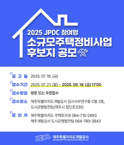 [뉴스노크=김인호 기자] 제주도와 제주특별자치도개발공사는 대규모 정비사업 추진이 어려운 노후주거지의 환경을 개선하고, 양질의 주택공급을 확대하기 위해 작년에 이어 올해에도 JPDC참여형 소규모주택정비사업 신규 후보지 발굴 공모를 실시한다고 21일 밝혔다.