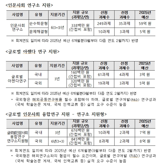 ‘인문사회 학술연구 지원사업’은 학문후속세대를 포함하여 연구자의 성장단계별 연구 역량을 강화하고, 대학 부설 연구소 중심의 집단연구 기반을 구축하기 위해 1963년부터 교육부가 추진해 온 인문사회 분야의 대표적인 국가 연구개발 사업이다.