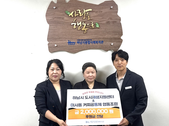 기부금 전달식은 15일 10시 하남시종합사회복지관에서 열렸으며, 하남시 신도시관리팀 방현준 팀장, 미사동커피공동체협동조합 김현경 대표, 하남시종합사회복지관 김혜성 관장이 참석했다.