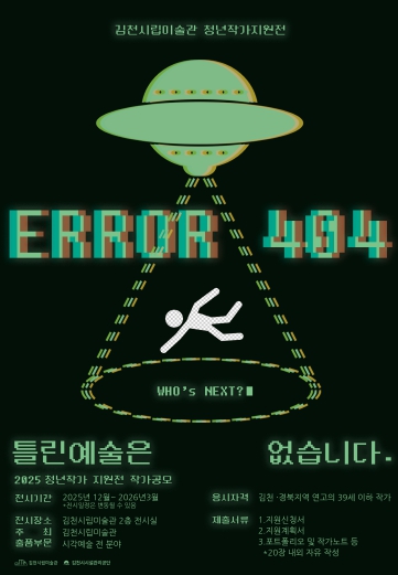 [뉴스노크=김인호 기자] 김천시시설관리공단이 운영하는 김천시립미술관은 지역 청년예술가의 창작 활동을 지원하고 예술적 성장을 돕기 위한 〈2025 청년작가 지원전 – ERROR 404 틀린 예술은 없습니다〉의 참여 작가를 모집한다고 밝혔다.