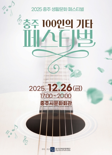 [뉴스노크=김인호 기자] (재)충주문화관광재단은 오는 12월 26일 충주시문화회관에서‘충주 100인의 기타 페스티벌’을 개최한다고 밝혔다. 이번 페스티벌은 충주 지역의 기타동아리들이 한자리에 모여 기타의 아름다운 선율을 시민들에게 선보이는 자리로, 통기타와 클래식기타를 모두 아우르는 공연 구성이 특징이다.