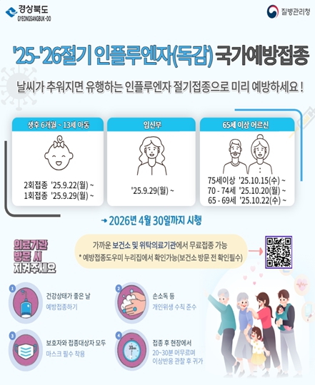 [뉴스노크=김인호 기자] 경상북도는 다가오는 겨울철 인플루엔자 유행에 대비해 22일부터 내년 4월 30일까지 고위험군을 대상으로 2025년~2026년 절기 인플루엔자 국가 예방접종을 한다.