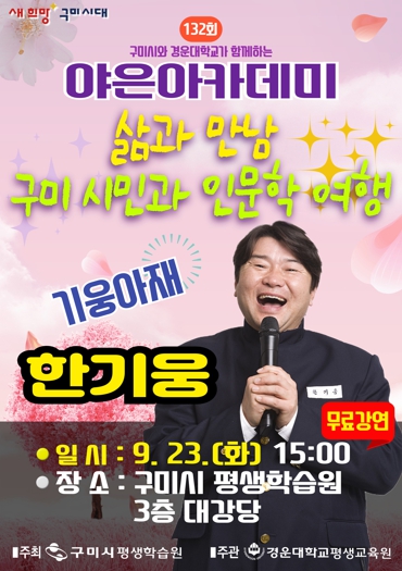 [뉴스노크=김인호 기자] 구미시는 9월 23일 오후 3시 구미시평생학습원 대강당에서 방송인 한기웅을 초청해 ‘삶과 만남, 구미시민과 인문학 여행’이라는 주제로 제132회 야은아카데미 특별 강연을 연다.