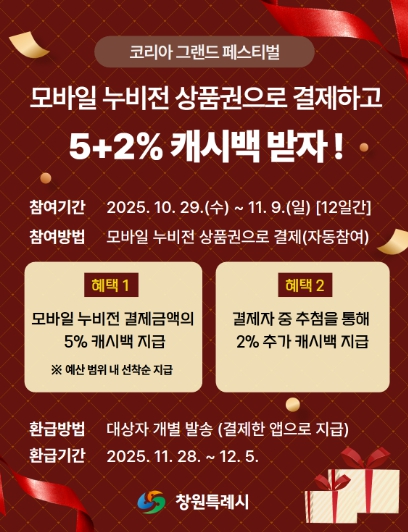 [뉴스노크=김인호 기자] 창원특례시는 오는 10월 29일부터 11월 9일까지 12일간, ‘코리아 그랜드 페스티벌’ 기간에 맞춰 모바일 창원사랑상품권 ‘누비전’ 결제 시 최대 7% 캐시백을 제공하는 특별 이벤트를 진행한다고 24일 밝혔다.