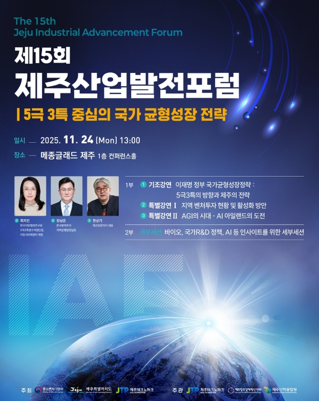 이날 포럼에서는 3개 분야 전문가가 기조강연을 펼친다. ▲최지민 한국지방행정연구원 5극 3특 연구지원단장은 ‘5극 3특의 방향과 제주의 전략’, ▲장남준 한국벤처투자 지역균형발전실장은 ‘지역 벤처투자 현황 및 활성화 방안’, ▲한상기 테크프론티어 대표는 ‘AGI의 시대 – AI 아일랜드의 도전’을 주제로 발표한다.