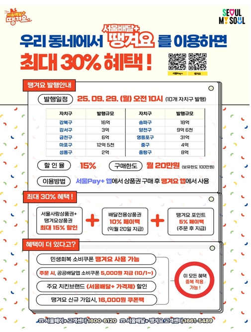 ' 29일(월)부터 ‘자치구 배달전용상품권’ 110억 규모 발행… ‘서울페이+’ 앱에서 15% 할인 판매'