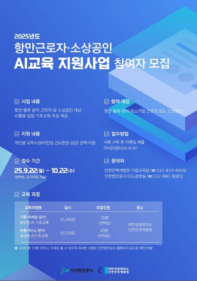 본 사업은 대·중견기업 대비 자기계발 교육 기회가 적은 항만·물류 분야 중소기업과 소상공인 총 40명을 대상으로 AI 역량 강화를 지원하기 위해 마련됐다. 항만·물류 업종이 아니더라도, 인천항 입주기업 근로자 또는 인천 소재 소상공인이라면 누구나 신청이 가능하다.