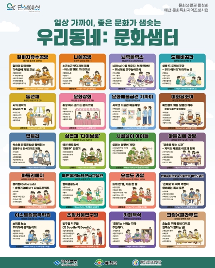 [뉴스노크=김인호 기자] (재)예천문화관광재단은 ‘문화특화지역 조성사업’의 일환으로 추진 중인 ‘우리동네 문화샘터’의 공간별로 세부 프로그램 공개, 오는 28일까지 참여자를 모집한다.