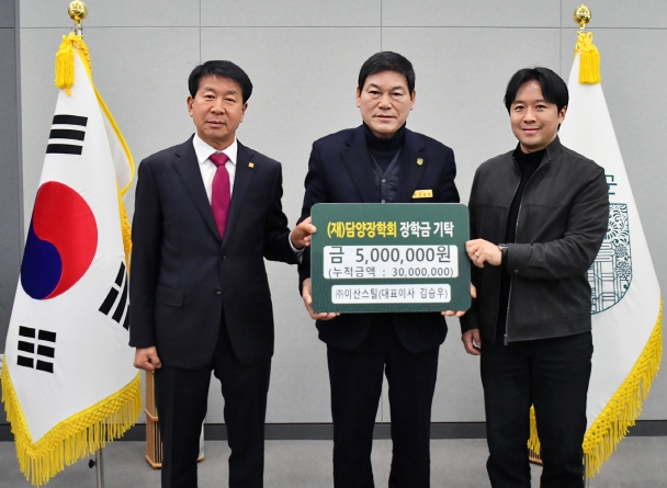 [뉴스노크=김인호 기자] (재)담양장학회는 지난 26일 ㈜이산스틸(대표이사 김승우)에서 5백만 원을, ㈜고서삼화자원(대표 이형수)에서 2백만 원을 기탁했다고 밝혔다.