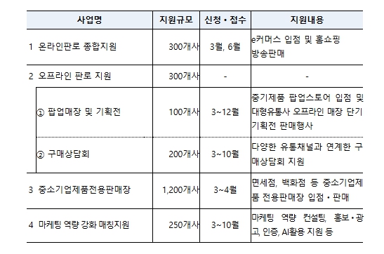 이번 사업의 총 지원 규모는 141억 7천만 원이며, 주요 지원 프로그램은 ①온라인 판로지원, ②오프라인 판로지원, ③중소기업제품 전용판매장 운영, ④마케팅 역량강화 프로그램 등이다.