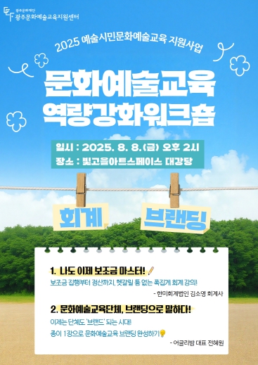 광주문화재단 노희용 대표이사는 “이번 워크숍은 문화예술교육 현장에서 실질적인 어려움을 겪고 있는 분들을 위한 밀도 높은 시간이 될 것”이라며, “보조금 정산이 막막하거나, 우리 단체의 색깔을 어떻게 보여줄지 고민하는 실무자들에게 특히 유익한 시간이 될 것”이라고 전했다.