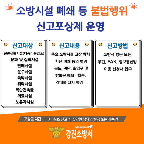 [뉴스노크=김인호 기자] 강진소방서는 소방시설 폐쇄·훼손 등 위법행위로 인한 인명피해를 예방하고자 ‘소방시설 불법행위 신고포상제’를 적극 운영하고 있다고 17일 밝혔다.