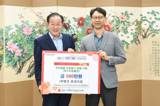 [뉴스노크=김인호 기자] 문경시는 지난 9월 23일, 추석 명절을 앞두고 지역 내 소외된 이웃들이 따뜻한 명절을 보낼 수 있도록 iM뱅크 문경지점(지점장 이영우)으로부터 온누리상품권 500만 원 상당을 기탁받았다.