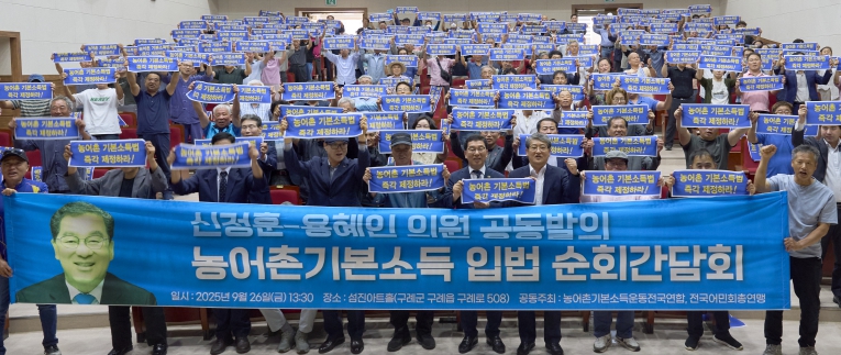[뉴스노크=김인호 기자] 지난 26일 구례섬진아트홀에서 열린 '농어촌기본소득 입법 순회 간담회'에서 구례군민 500여 명이 참석해 농어촌기본소득 시범사업 대상지로 구례군을 선정해 달라고 한목소리로 호소했다.