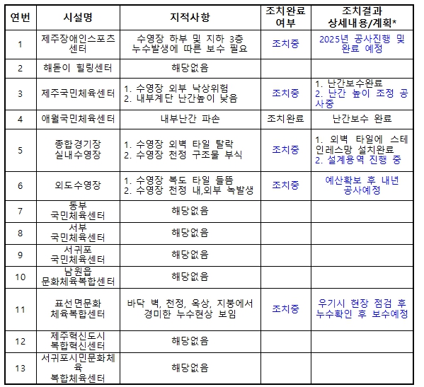 점검 결과 6개소에서 일부 구조물 부식, 외벽 타일 탈락, 낙상 위험 및 난간 파손 등이 확인됐다. 타일 탈락 및 난간 파손 등 경미한 사항은 조치를 완료했으며, 장기계획이 필요한 사항은 응급조치 후 예산을 확보해 시정해 나갈 계획이다.