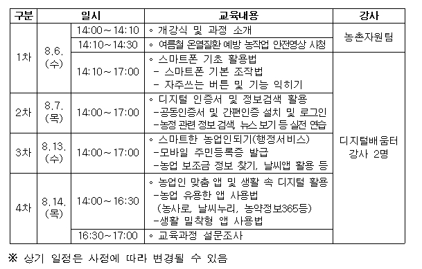 교육은 스마트폰 기초 사용법, 디지털 인증서 발급, 농업 보조금 정보 검색, 농업 관련 앱 활용 등 실생활에 유용한 내용을 중심으로 구성된다.