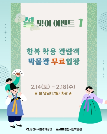 [뉴스노크=김인호 기자] 김천시시설관리공단(이사장 김재광)은 2026년 설 명절을 맞아 감문국이야기나라와 김천시립박물관을 중심으로 가족 단위 관람객이 함께 즐길 수 있는 ‘설맞이 문화 행사’를 운영한다. 이번 행사는 2월 14일부터 2월 18일까지 진행된다.