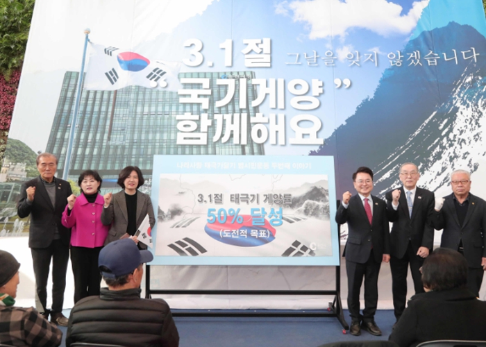 시는 지난해 처음으로 실시한 범시민 태극기 달기 운동으로 3·1절 기준 11.2%에 불과했던 태극기 게양률을 광복절 29.1%, 개천절 29.8%까지 끌어올리는 성과를 거뒀다. 올해는 이 같은 성과를 바탕으로 3‧1절 태극기 게양률을 50%까지 끌어올리는 도전적인 목표를 세우고 범시민운동을 연중 종합적으로 추진한다.