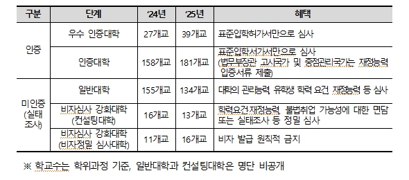 한편, 인증대학 외에 외국인 유학생이 1명 이상 재적 중인 대학에 대해서는 ‘유학생 유치‧관리 실태조사’를 실시하고, 일정 기준을 충족하지 못할 시 비자심사 강화대학(컨설팅대학, 비자정밀 심사대학)으로 지정했다. 이를 통해 대학이 외국인 유학생의 유치 단계에서 어학 능력과 재정 능력 등을 엄격히 심사하도록 하고, 유학생 관리 전반에 대한 대학의 책임을 강화할 예정이다.