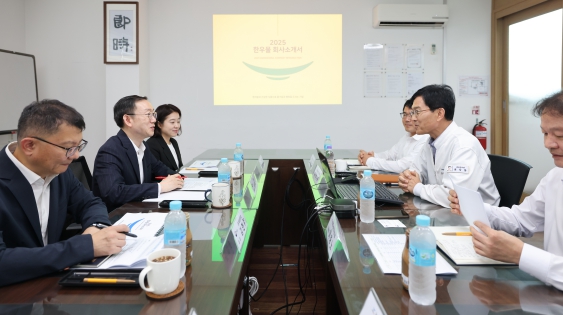 ▲ 이명구 관세청장(왼쪽 가운데)이 7일 오전 전북 김제에 소재한 농업회사법인(주) 한우물을 방문하여 업체관계자들과 간담회를 개최하고 있다 |