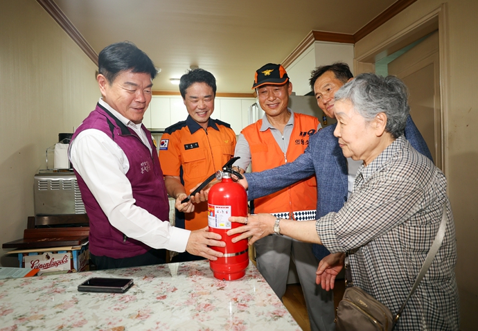 이날 현장에서는 소방시설 관리 실태를 비롯해 화재수신반 작동 여부, 비상방송설비 점검, 피난구 유도등 확인, 방화문 상태(세대별‧계단실‧엘리베이터실 방화문, 옥상출입문 등) 확인, 피난계단 장애물 적치 확인, 옥내 소화전 점검 및 등 공용부분 전반을 꼼꼼히 살폈다. 더불어 독거 어르신 댁에 방문하여 소화기 작동 여부 등을 점검했다.