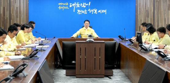 ▲ 김영록 전라남도지사가 13일 오후 도청 재난종합상황실에서 실국장 등이 참석한 가운데 ‘집중호우 대비 대처상황보고회’를 주재하고 있다. |