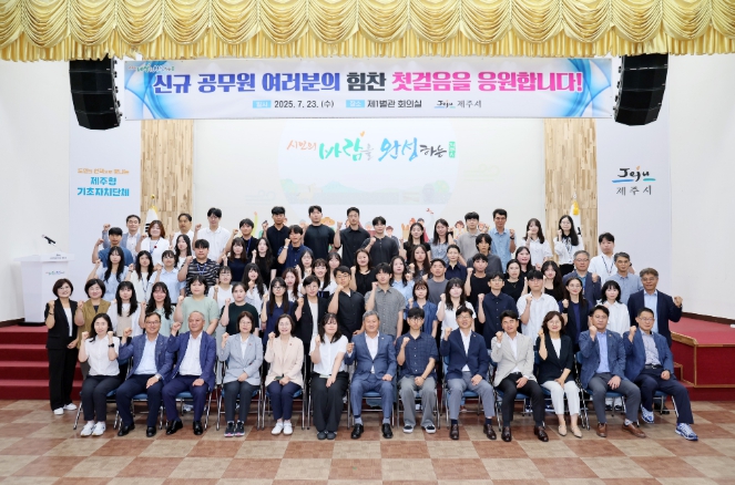 [뉴스노크=김인호 기자] 제주시는 7월 23일 시청 제1별관 회의실에서 신규 공무원 48명을 비롯한 제주시 공직자 150여 명이 참석한 가운데 신규 공무원 임용 축하 행사를 개최했다.