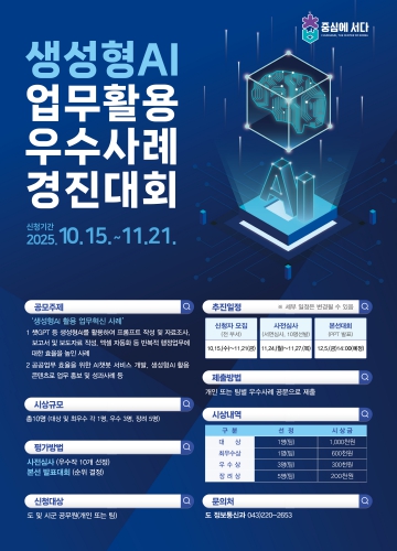 최병희 충북도 행정국장은 “이번 대회는 공무원들이 인공지능(AI)을 활용한 우수사례를 함께 공유함으로써 스마트한 행정 문화를 확산하는 계기가 될 것”이라며, “앞으로도 행정업무 혁신을 위해 다양한 노력을 이어가겠다”고 말했다.