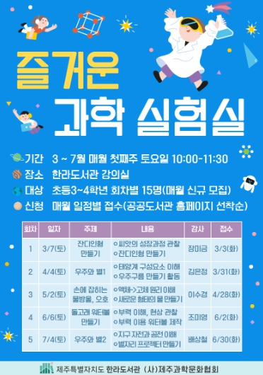 한지운 한라도서관장은 “제주과학문화협회와의 협업으로 어린이들에게 양질의 과학 체험 기회를 제공할 수 있게 됐다”며 “앞으로도 지역 어린이들의 창의력과 탐구심을 키우는 다양한 프로그램을 발굴해 나갈 것”이라고 말했다.
