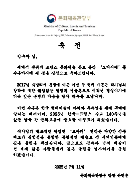 [뉴스노크=김인호 기자] 문화체육관광부 유인촌 장관은 7월 11일, 프랑스 문화예술 공로 훈장 ‘오피시에’를 수훈한 한국 현대미술 김수자 작가에게 축전을 보내 축하와 감사의 뜻을 전했다.