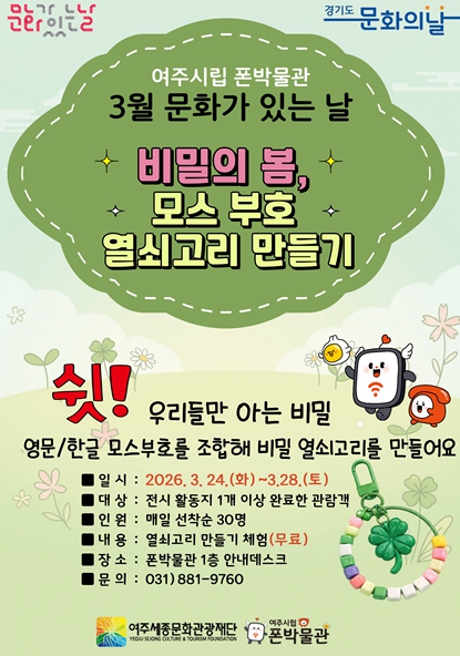 [뉴스노크=김인호 기자] 여주세종문화관광재단이 운영하는 여주시립 폰박물관은 3월 '문화가 있는 날'을 맞아 오는 24일부터 28일까지 5일간 시민 참여형 행사 ‘비밀의 봄, 모스부호 열쇠고리 만들기’를 운영한다.