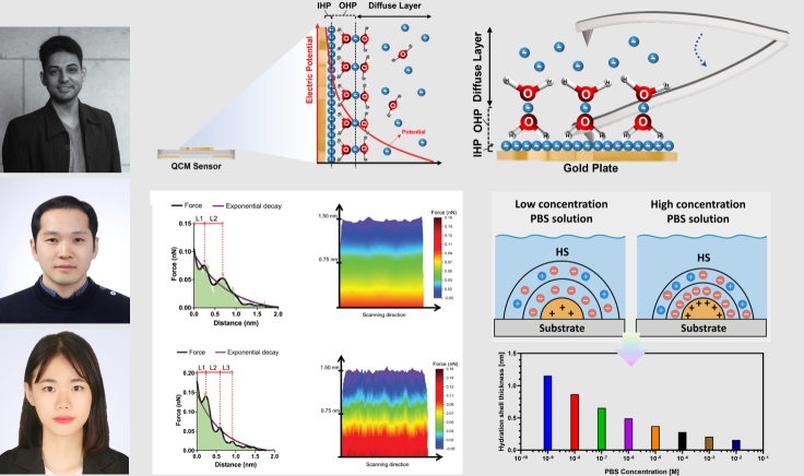 ▲ Ulster University의 Nikhil Bhalla 교수(상), 전남대학교 이두진 교수(중), 송예은 박사과정생(하)이 참여한 국제 공동연구를 통해 고체-액체 계면에서 이온 농도에 따른 수화 구조 및 전기이중층 특성을 정량적으로 분석한 연구 개요. |